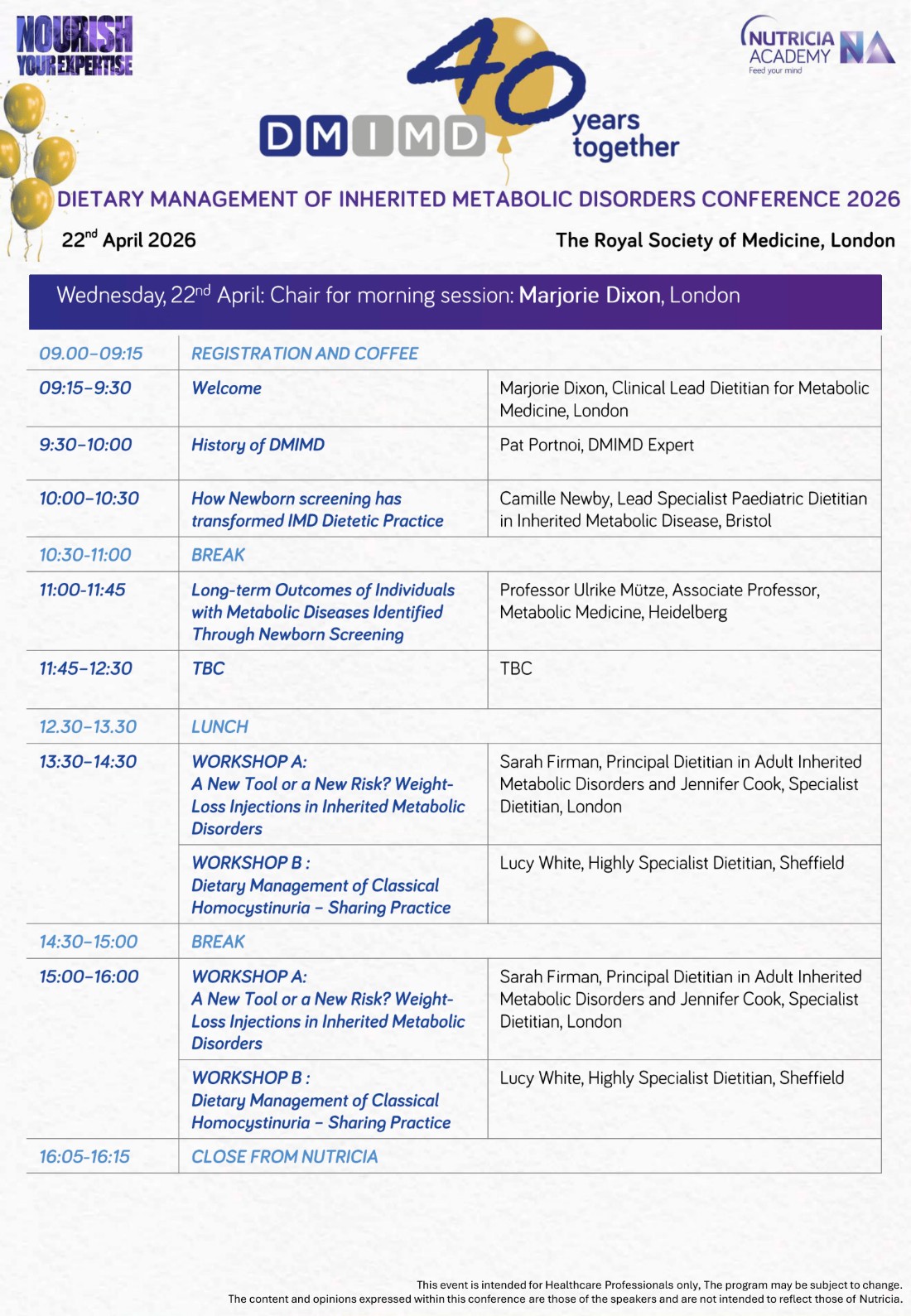 We are delighted to invite you to the 40th Anniversary of DMIMD, marking four decades of innovation and collaboration in Metabolic care. In partnership with leading Metabolic Dietitians and Healthcare Professionals, Nutricia has been at the heart of this journey, driving progress and shaping the future of Specialised Nutrition.